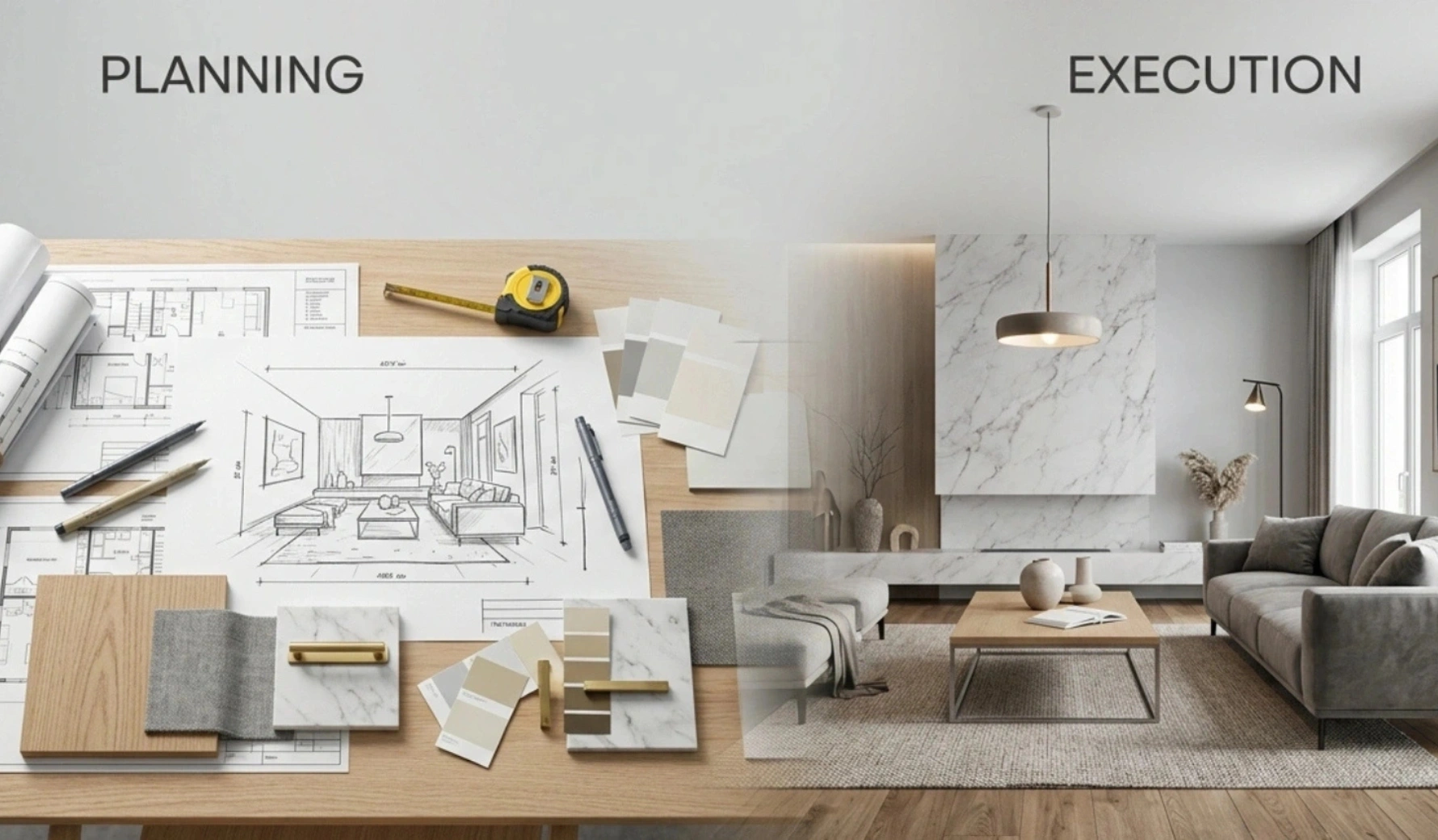 Turnkey means complete project handling from start to finish, including design, materials, and execution, so the final space is ready without additional effort or coordination.